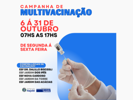 A Prefeitura Municipal de Itajobi, por meio do Departamento Municipal de Saúde, informa o início da Campanha de Multivacinação, que acontece de 06 a 31 de outubro.